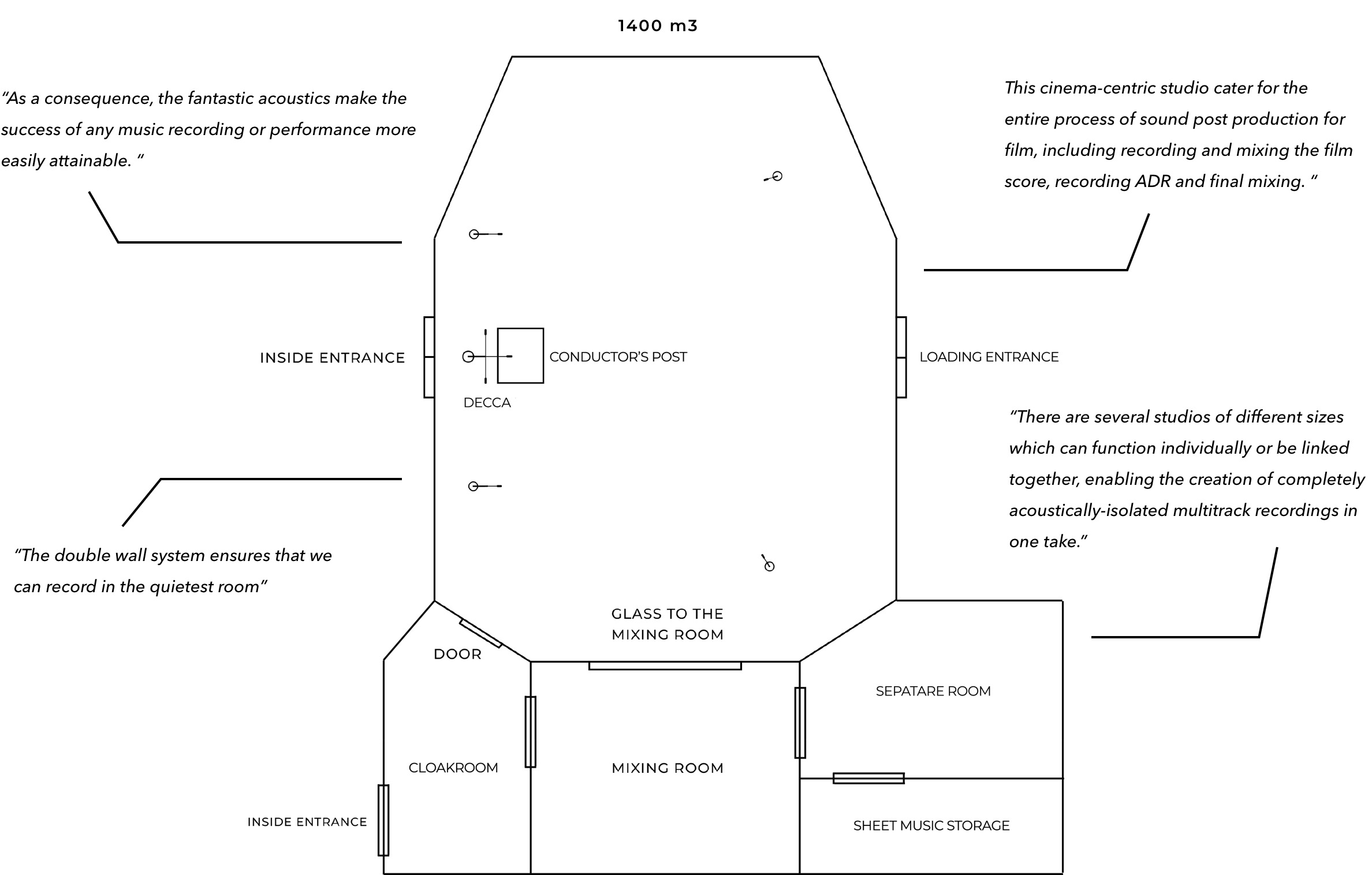 As a consequence, the fantastic acoustics make the success of any music recording or performance more easily attainable. These cinema-centric studios cater for the entire process of sound post production for film, including recording and mixing the film score, recording ADR and final mixing. Each studio is ready for collaboration online all tasks can be controlled or supervised from around the globe.